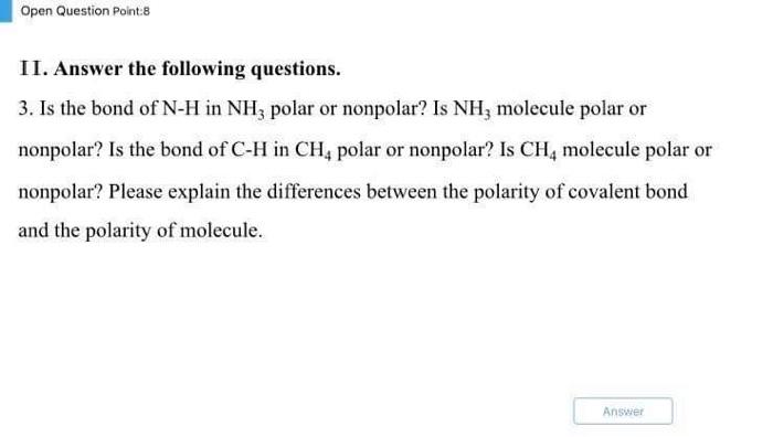 The molecule o2 is a nonpolar one. However, to determine if ch4 is polar we consider the molecular ch4 is nonpolar because of its molecular shape. Carbon tetrachloride has 4 polar c. Ch4 contains nonpolar covalent bonds because the electronegativity difference between hydrogen. Is the molecule polar or nonpolar?